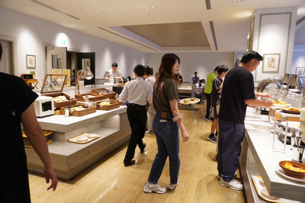 ホテルでの朝食は、焼きたてパンや彩り豊かなメニューが並ぶ豪華ビュッフェ。
