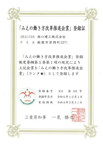 「みえの働き方改革推進企業」に登録されました